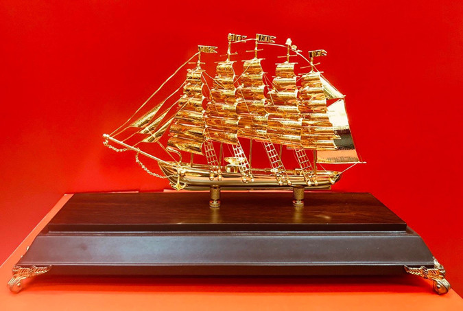 - Chất liệu: Mô hình thuyền mạ vàng 24k, đế gỗ phủ sơn, mác in kim loại, hộp giấy mỹ thuật cao cấp